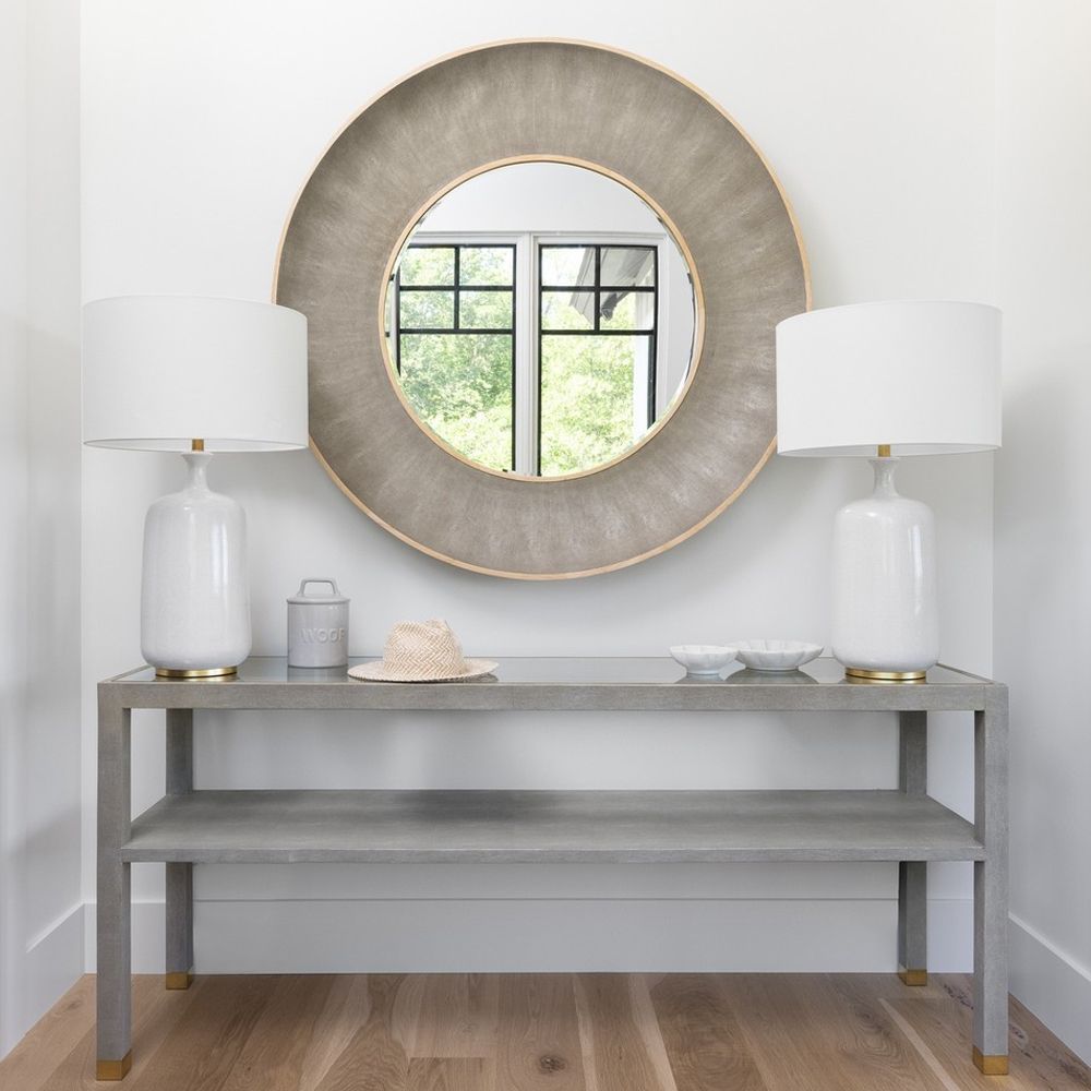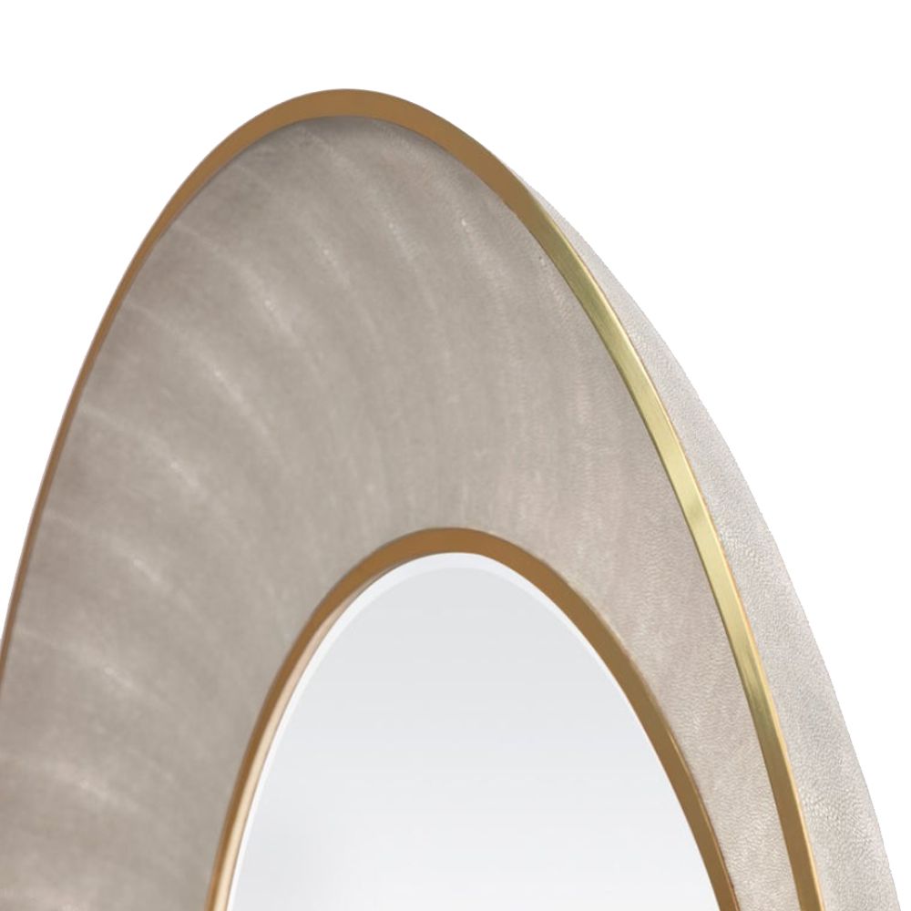 Round Faux Shagreen and metal framed mirror in Sand and Brass finishes. Sand shagreen frame is also available in Sycamore wood trim. Available in other faux shagreen finishes - Cool Grey, Juniper, Snow and Black with either brass or silver trim and in smaller size (38 dia.).