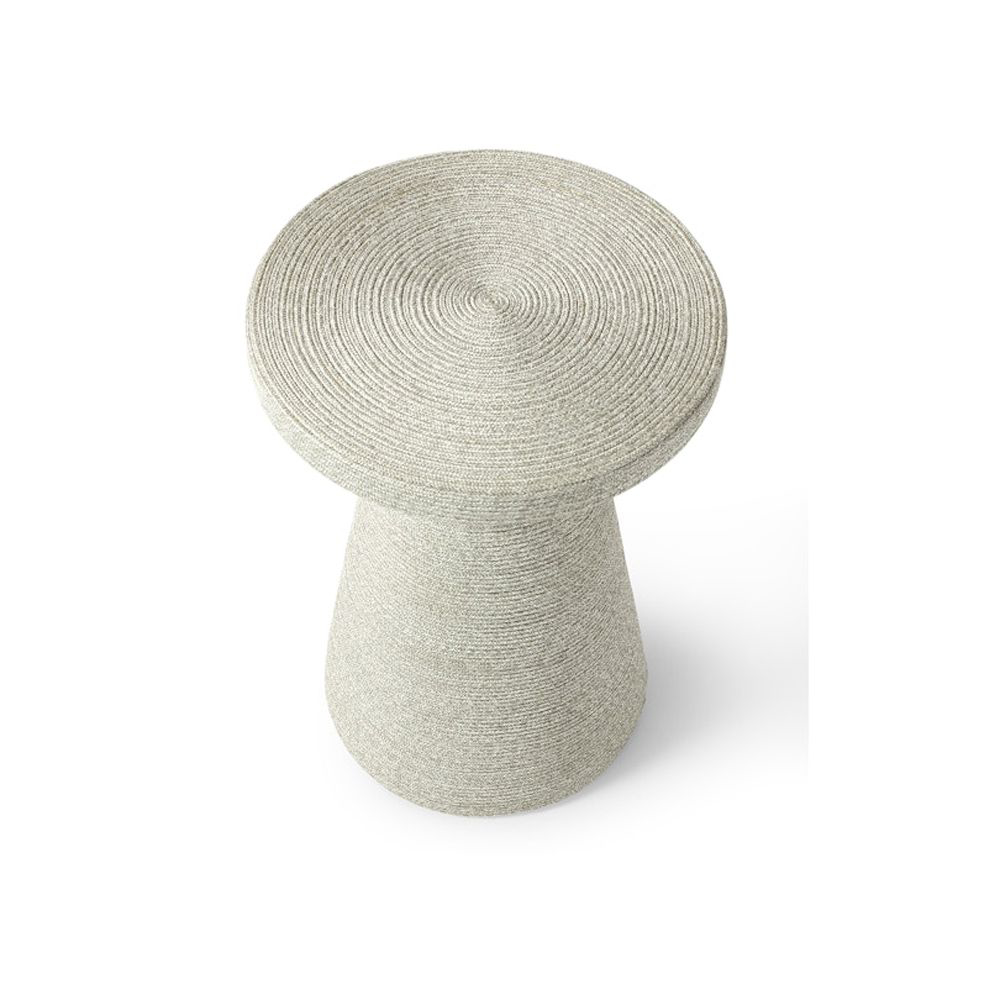 Round synthetic rope design side table in Warm Grey finish on top of a fibreglass frame. Suitable for outdoor use. (discontinued product).