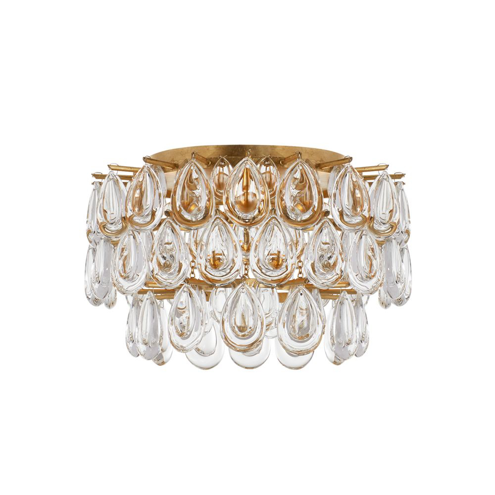 AERIN design metal 3-light semi-flush mount light in Gild finish with crystals. Also available in Burnished Silver Leaf finish. 9" dia. gild canopy.