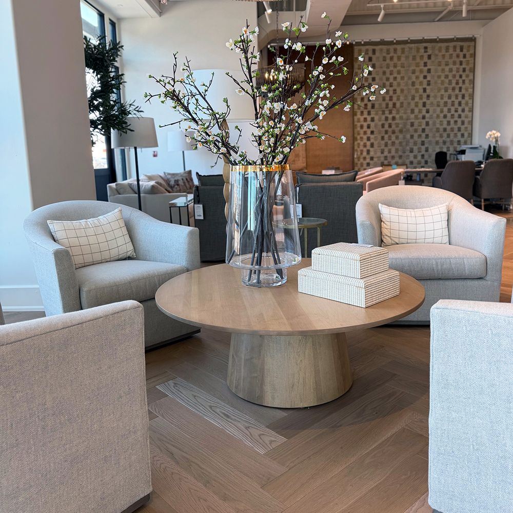 CASE custom design round coffee table is done in White Maple with a Sombrero stain. 1.75" thick top with 3/4" edge detail.This coffee table is part of our CASE by Cocoon program and can be customized by changing the dimensions (width, depth, height), finish (paint or stain), wood type (maple, oak, walnut), or configuration (number of drawers, shelves, pull-outs, etc).