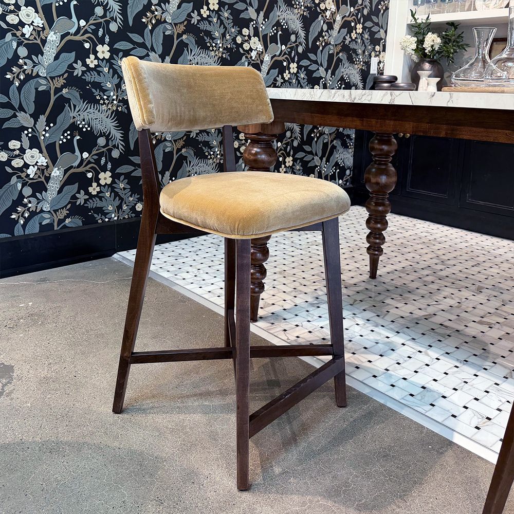 CASE custom design curved back counter chair with Maple wood legs and metal foot rest in Brushed Nickel, Brass or Matte Black finish. Priced with 1.5 yd of mid-level fabric. This dining chair is part of our CASE by Cocoon program and can be customized by changing the finish (paint or stain), wood type (maple, oak), or fabrics.