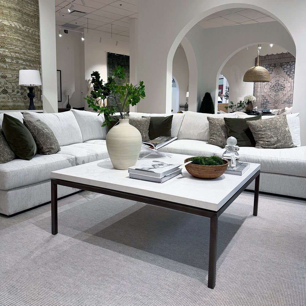 Nordy Bronze finished square metal cocktail table with Newport Matte stone top. This table is part of our CASE by Cocoon product line and is available in custom sizes, in alternate finishes, and in a extensive selection of Cambria stone tops.