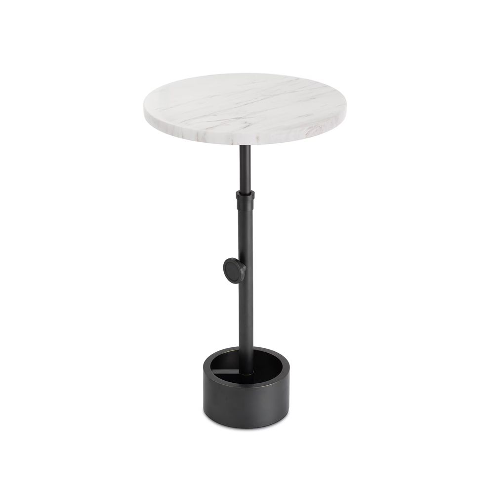 Round adjustable height accent table with white marble top and oil rubbed bronze finish.