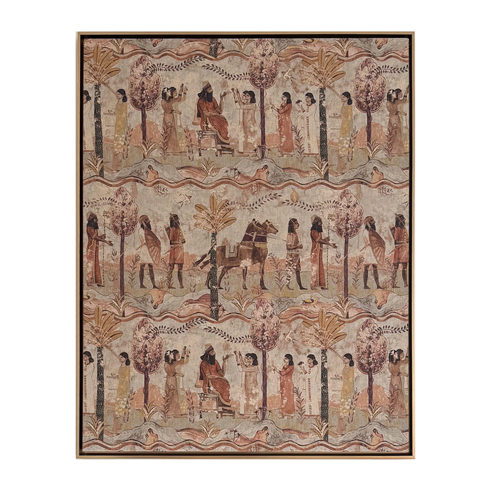 Stained wood framed fabric in an ancient pattern. Available in different size and frame configurations.