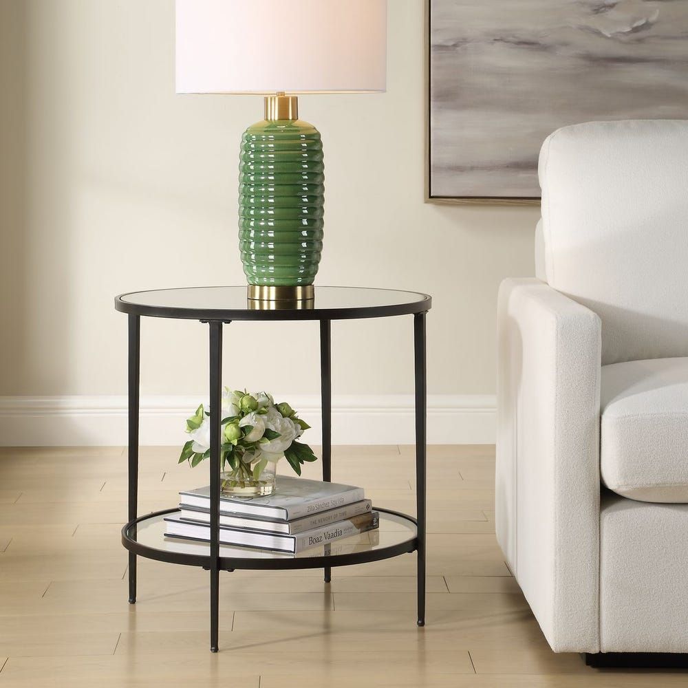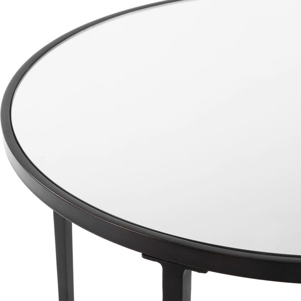 Round end table with mirror top and lower clear glass shelf. Finished in Satin Black powder coat.