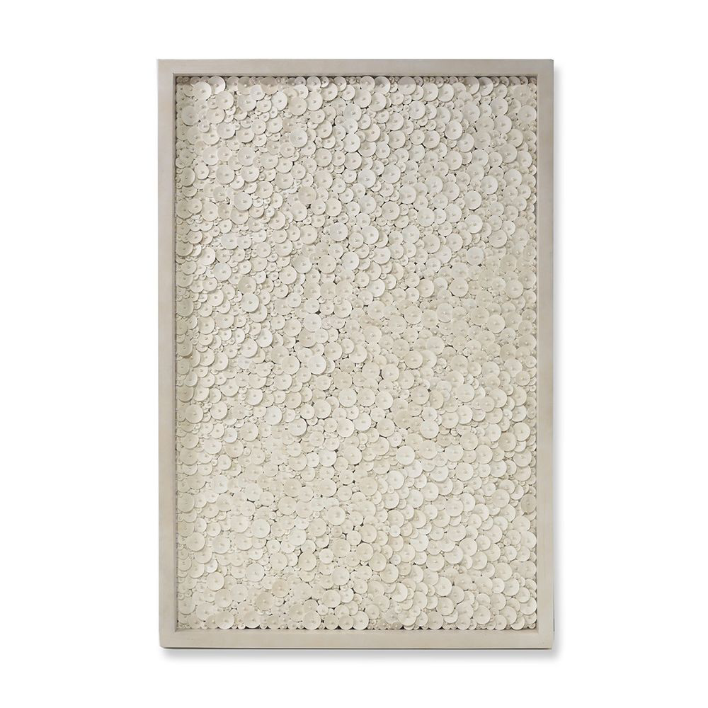 Decor features coconut shell discs and beads hand-sewn together over a metal base with a natural wood frame. Wall decor comes with metal hangers for mounting both vertical and horizontally.