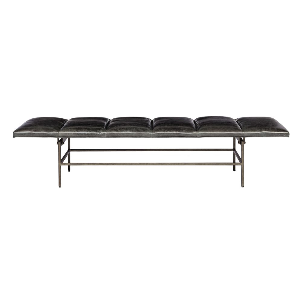 Stainless steel framed leather ottoman with channel tufting.