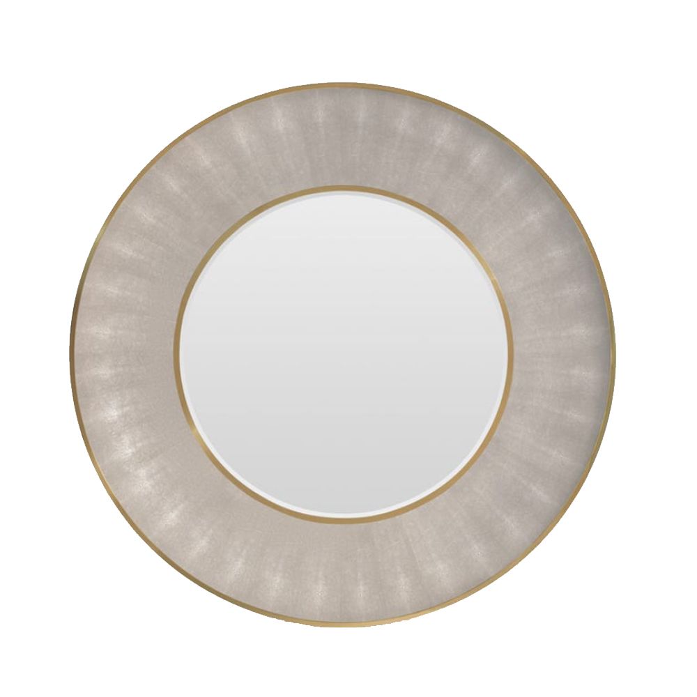 Round Faux Shagreen and metal framed mirror in Sand and Brass finishes. Sand shagreen frame is also available in Sycamore wood trim. Available in other faux shagreen finishes - Cool Grey, Juniper, Snow and Black with either brass or silver trim and in smaller size (38 dia.).