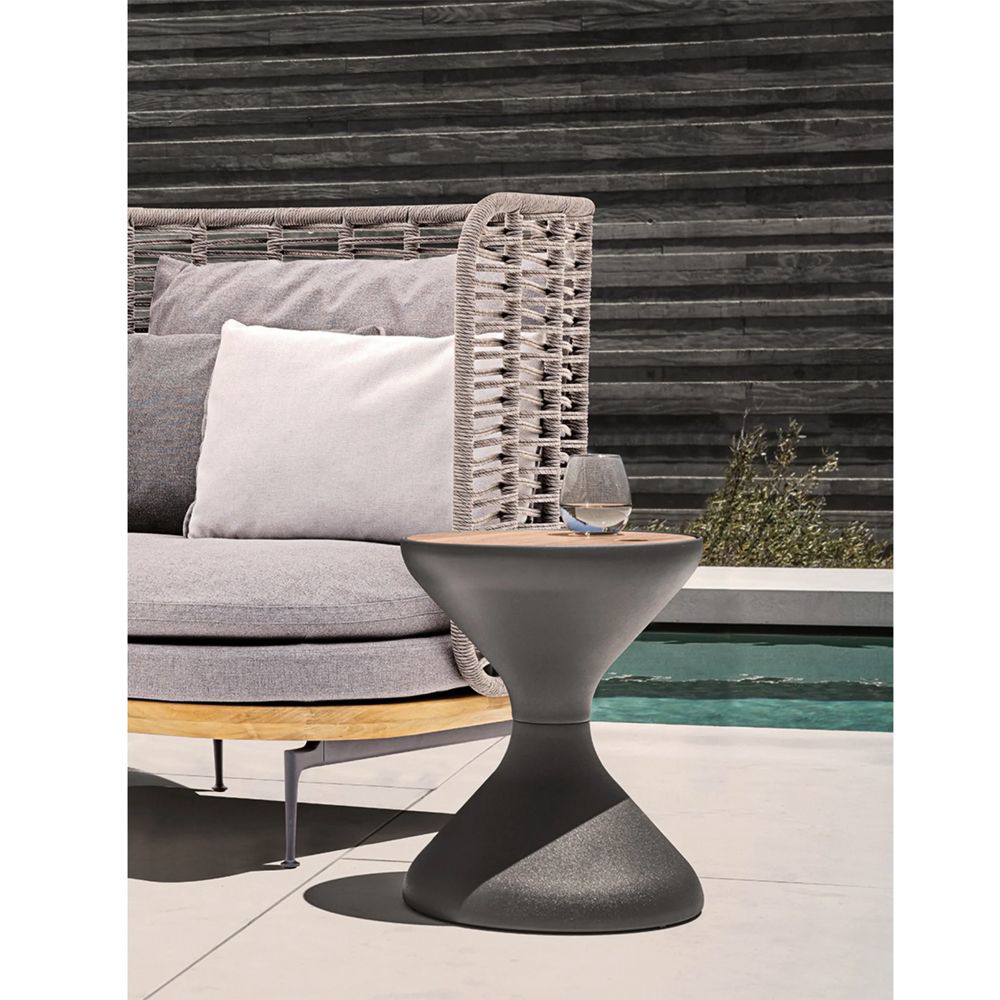 Meteor powder coat finished round aluminum side table with natural teak top tray. Tray is removable to make way for an ice bucket.