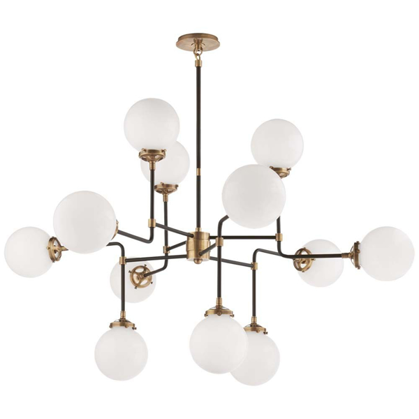 Studio designed 12-light metal chandelier in Hand-Rubbed Antique Brass and White glass. Fixture 52" with fixture and ceiling rods.Finishes: HAB, PNLamp: 12 x 40w E12 Candelabra bulb.