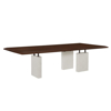 Ray Booth design rectangular walnut dining table with marble and metal pedestal bases. Available in a range of finishes.