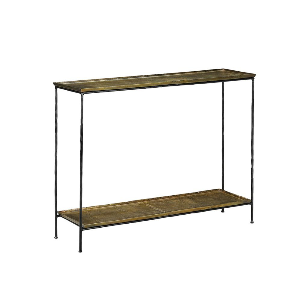 Forged iron console table in a Black iron finish with Antique Brass tray-tops.