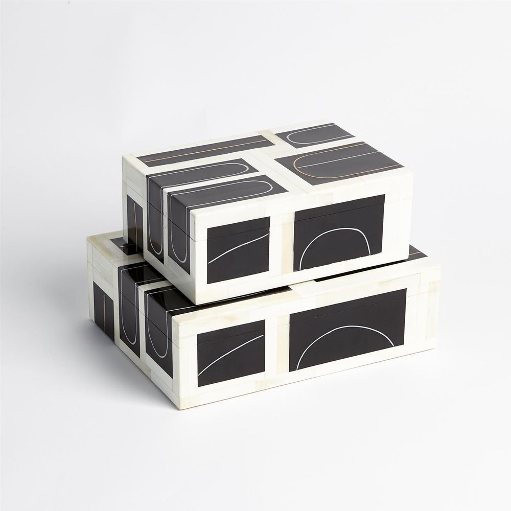 A resin and bone exterior box features a brass filet loop that is inlaid