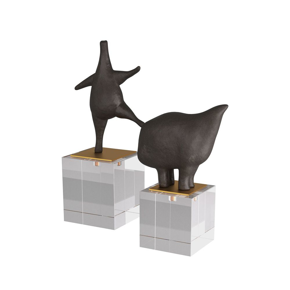 Carved Black Riverstone creatures atop a crystal cube stand with Antique Brass accents.
