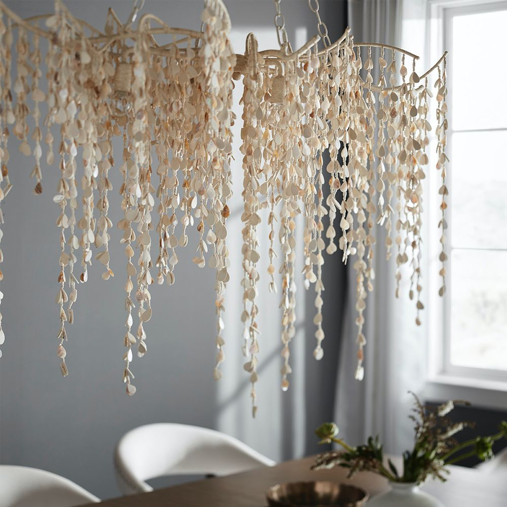 Strands of tiny wood beads embellished with teardrop shaped wood and shell details all in soft white tones attached to a hand-wrapped natural abaca powder coated metal frame. Chandelier comes complete with a cream finished chain and canopy hanging kit. LED bulbs required, not for use with incandescent bulbs.