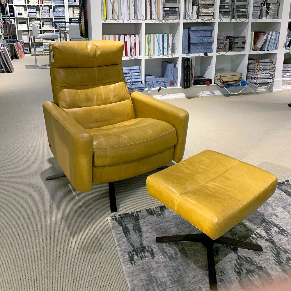 Reclining chair with patented mechanism for comfort. Tight channeled back and seat cushions. Starting at price is in fabric cover (Gr.I)