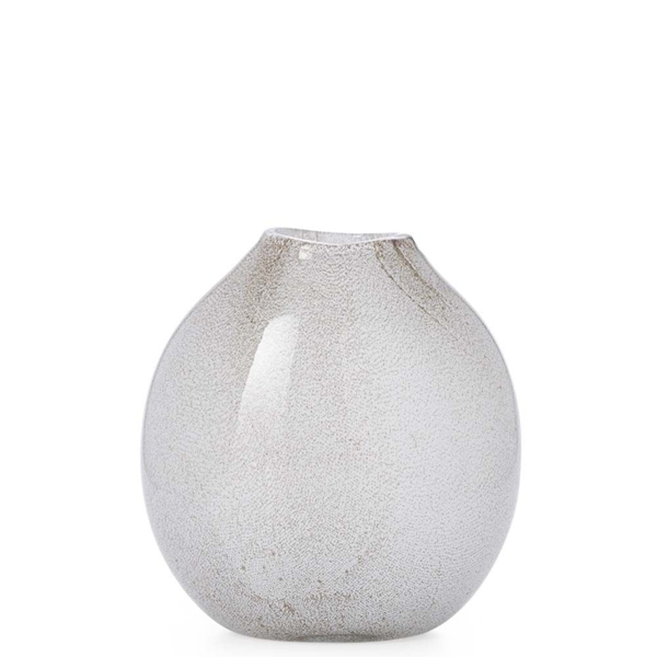 Handmade round glass vase in white with metallic flecks and bubbles.