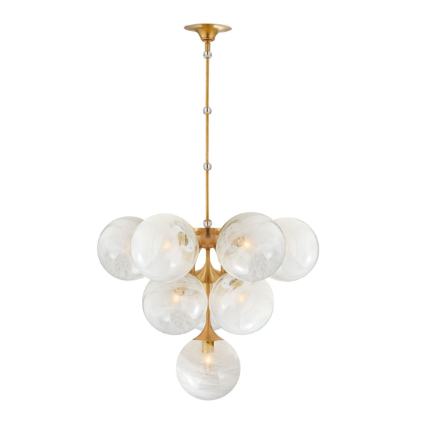 AERIN design metal chandelier in Hand-Rubbed Antique Brass finish with White Glass. Also available in Polished Nickel finish. 6" dia. canopy.