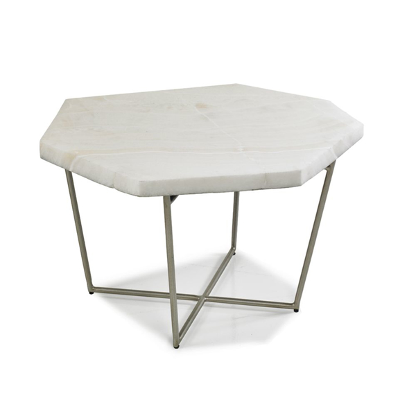 Unique shaped cocktail table with Onyx top and Champagne finished metal base. Stone top colouration will vary.