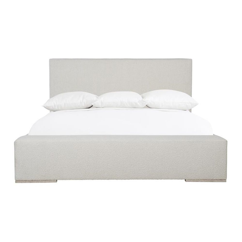 Fully upholstered king bed with block legs finished in Flaxen on White Oak. Complete with slat support system.