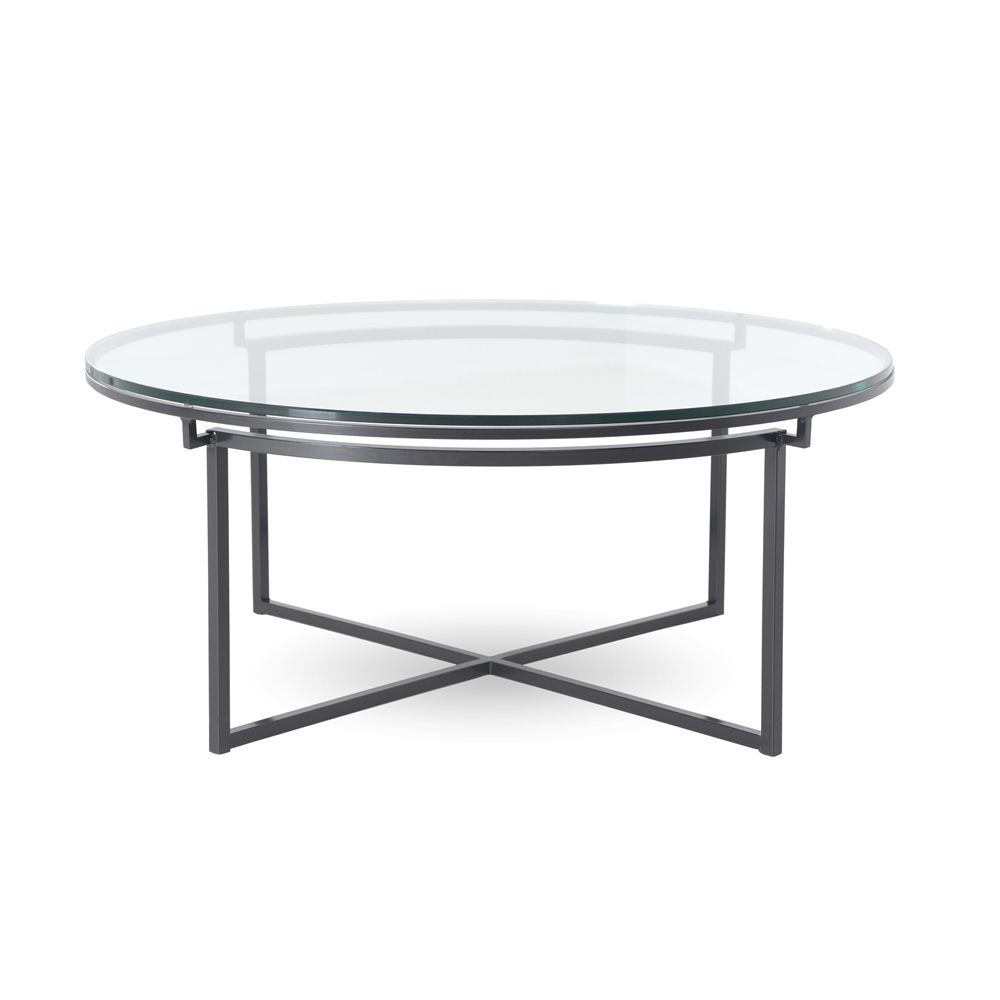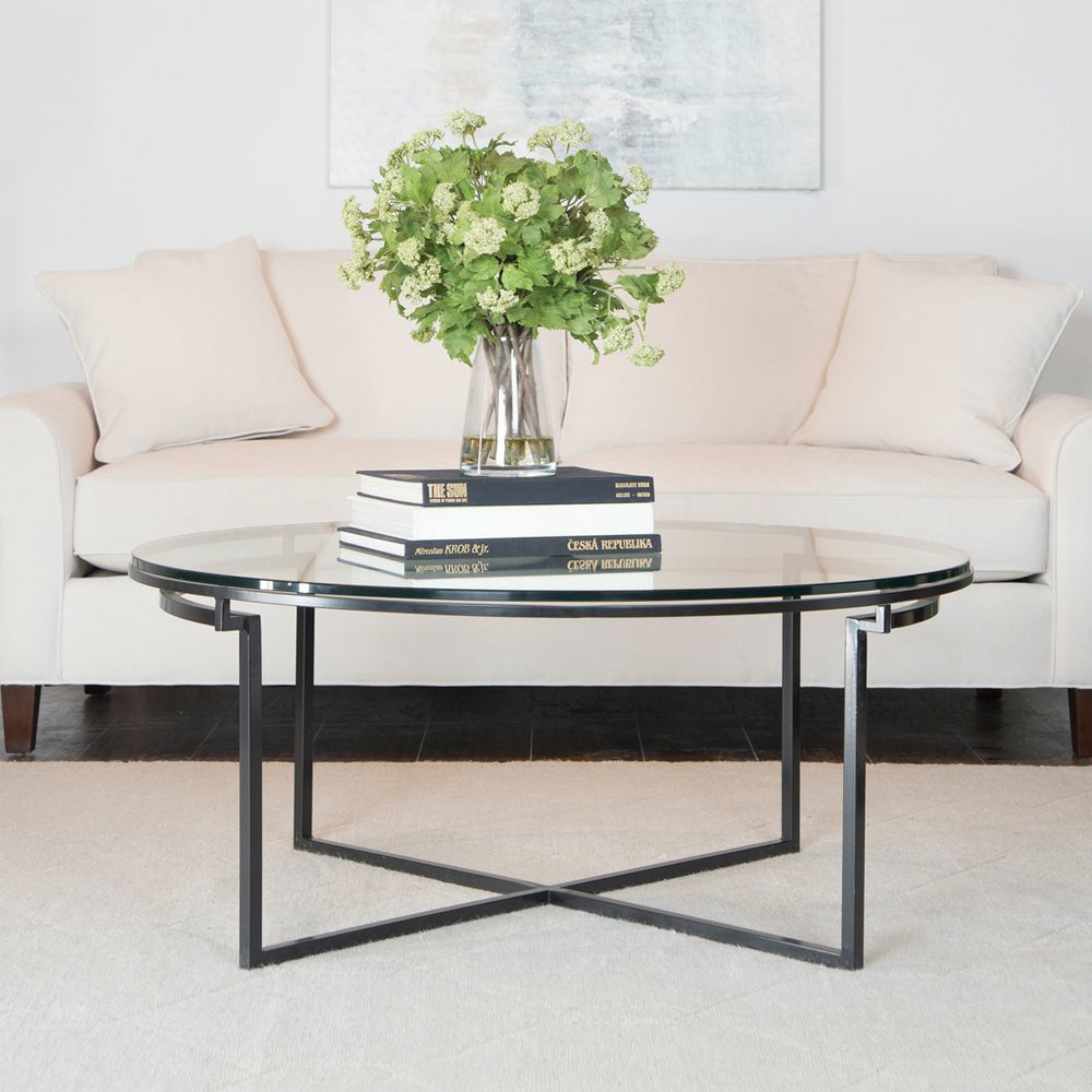 Round hand-forged iron cocktail table with 1/2" glass or 3/4" wood top. Available in Maple wood species and a range of wood and standard and premium metal finishes.