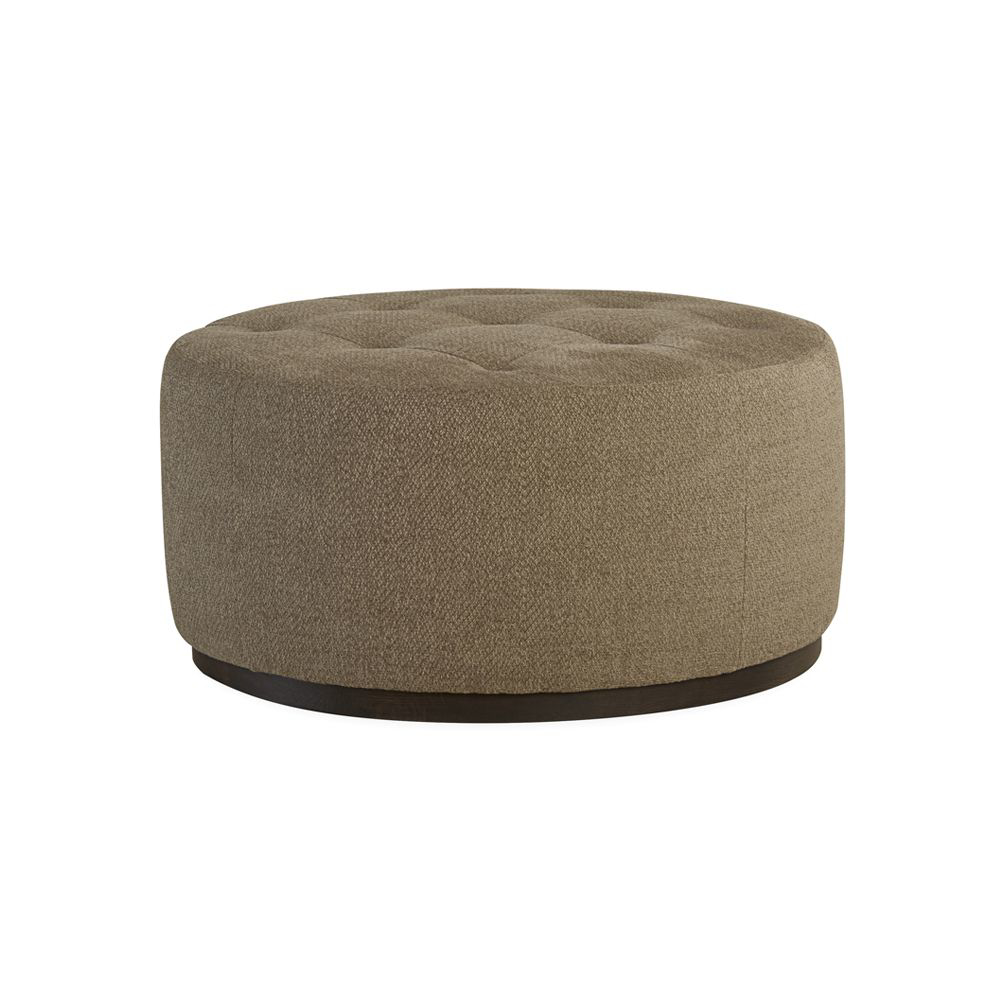 Round upholstered ottoman with Waffle Tufting. Standard with French seam, oak base, and fibre wrapped foam core seat.