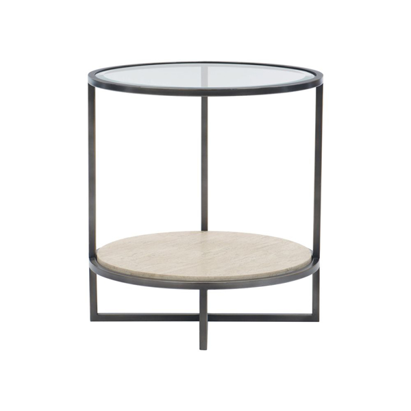 Oil Rubbed Bronze finished metal side table with tempered glass top and White Travertine stone shelf.