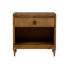 Single drawer nightstand with reeded drawer fronts, turned legs, Antique Bronze pull hardware, and pull-out tray shelf.Nightstand is part of a customizable program that allows for different configurations (1 drawer, 3 drawer), different leg options (turned, tapered, metal, block), and different drawer fronts (plain, cordouroy, readed, or paneled). Available in a range of stains and painted finishes.