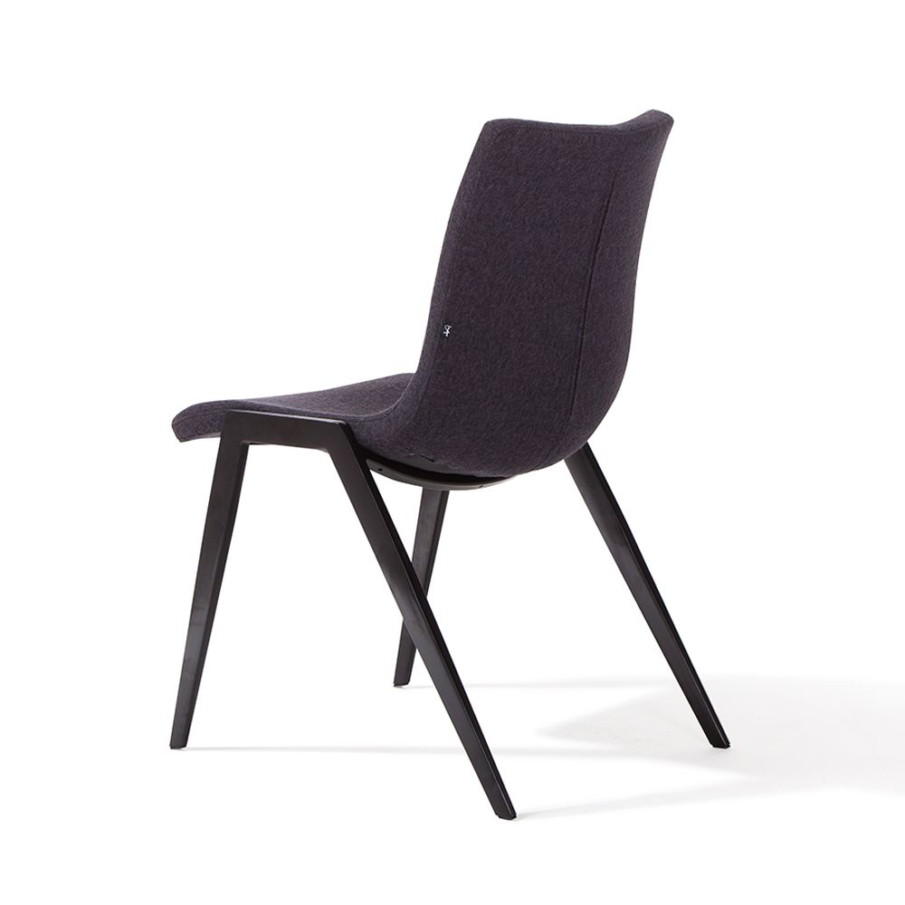 Upholstered dining chair on a Black Matte finished metal frame. Showroom model in COM AVG Casual 150.