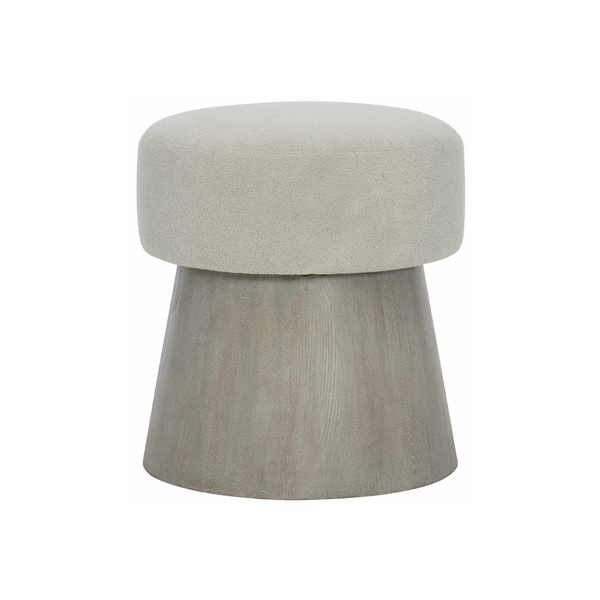 Conical shaped ottoman with upholstered top and Cerused Greige finished base.