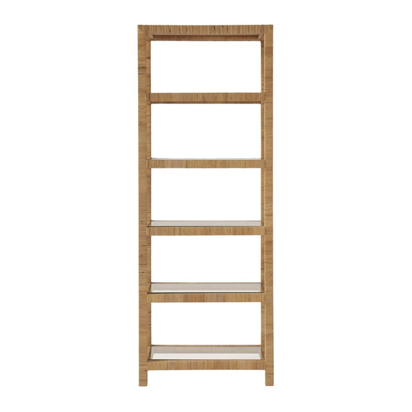 Wrapped Split Rattan etagere table with 5 inset glass shelves.