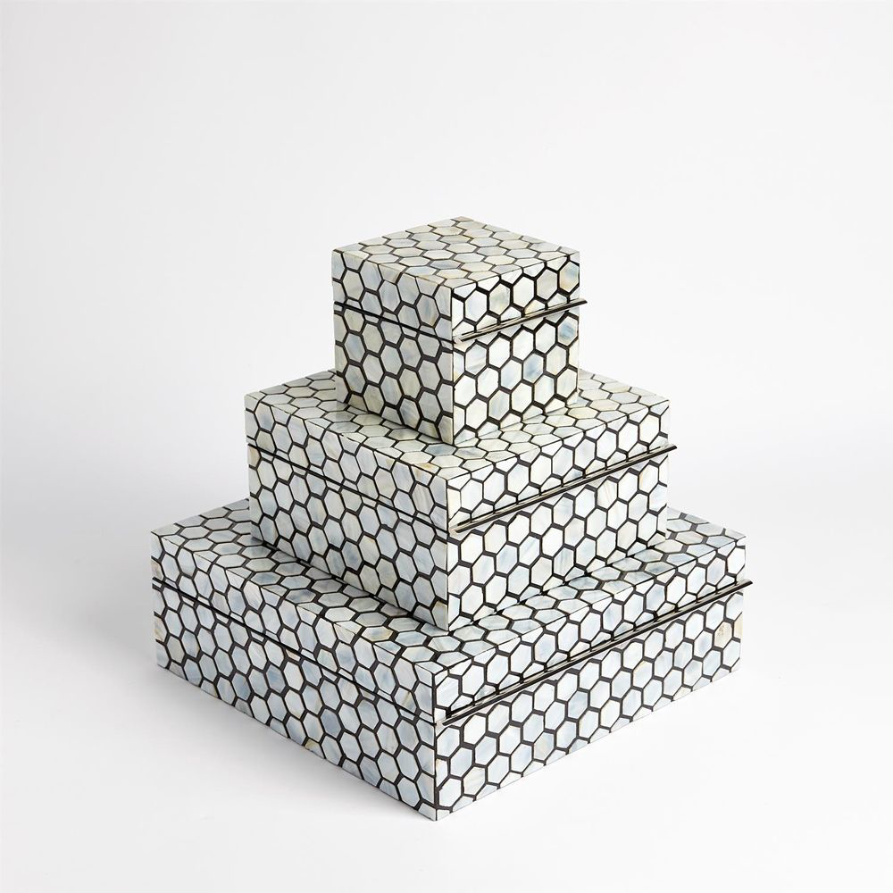 Blue hued Mother of Pearl pattern with Black accents and metal hinge. Interior is wood lined.