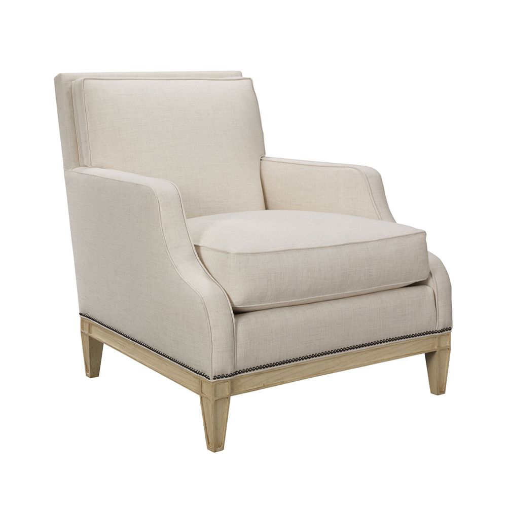 Shown in grey fabric with Parchment painted finish and optional nail head trim.
