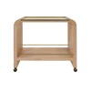 Waterfall styled oak bar cart in Natural Oak finish with brass accents and clear mirror tray surface. Also available in Espresso Black finish.