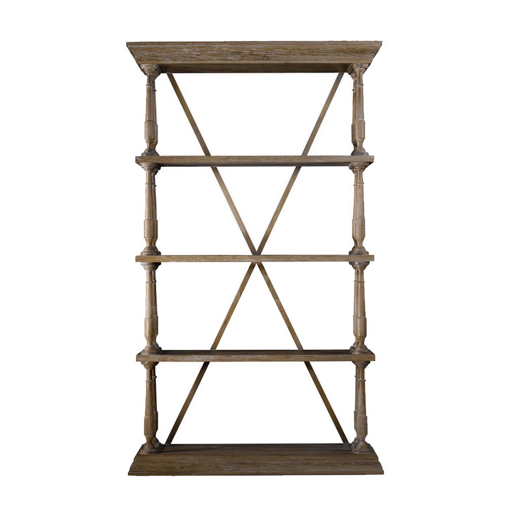 Natural finished rustic hardwood bookshelf with antique turned supports and trim.