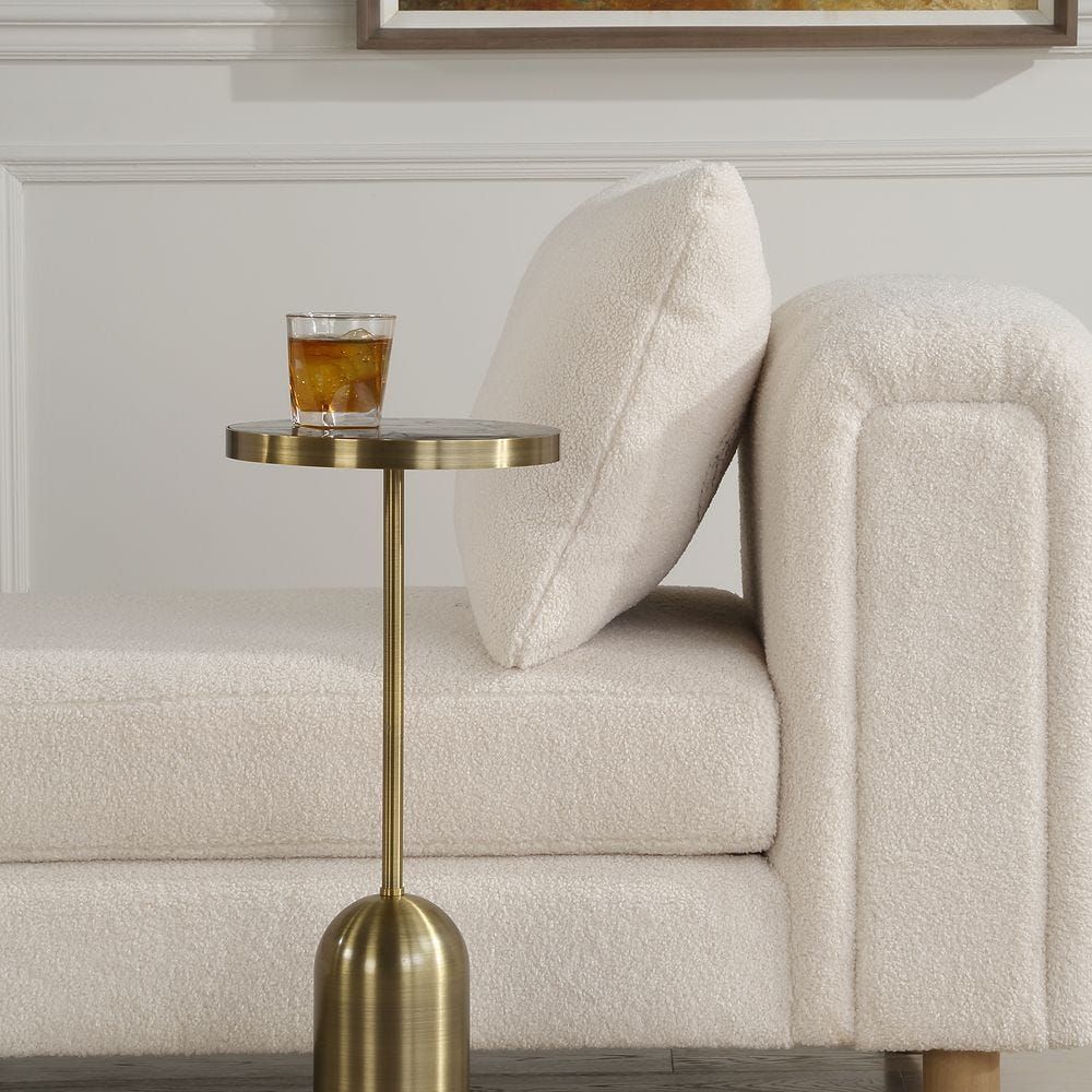Round metal drink table finished in Brushed Brass with an Iridescent Labradorite stone inste top.