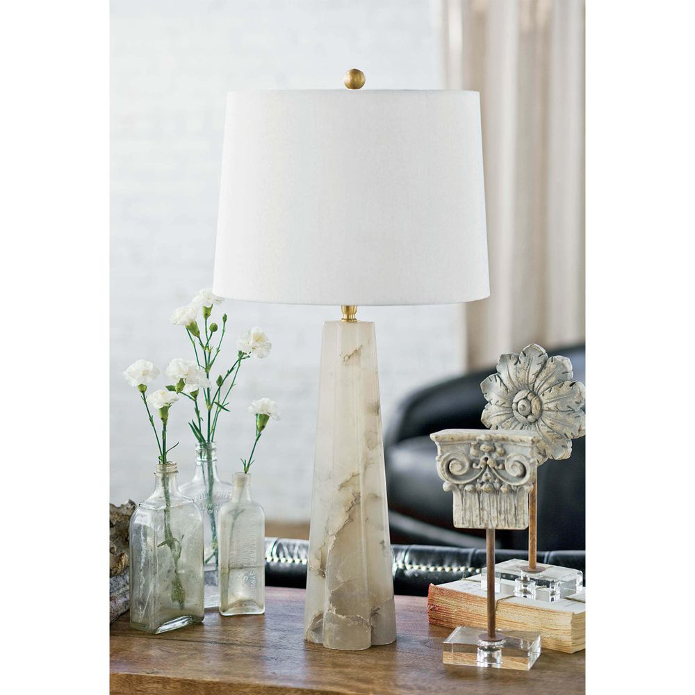 Natural Alabaster table lamp with Brass accents and White Linen shade. Note: Alabaster is a natural product and as such has variations in the appearance from one lamp to the next.