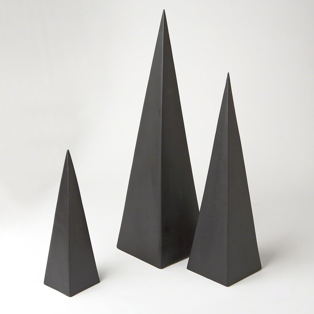 Set of 3 ceramic pyramid shaped objects in Matte Black finish. Various heights - 14.5h, 9.5h, and 5.75h.