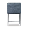 Two door cabinet with Graphite slate veneer exterior with Arctic grey cerused Oak interior. Antique Venetian pewter finish wrought iron base. Behind two doors is one adjustable glass shelf and mirror back panel. (Discontinued product).
