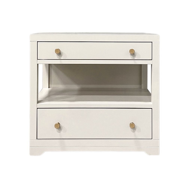 CASE custom design nightstand with 2 drawers and open shelf space above and plinth base. Shown with 4 satin brass Cadet Knobs. Finish in BM OC-20 Pale Oak on Maple wood.This nightstand is part of our CASE by Cocoon program and can be customized by changing the dimensions (width, depth, height), finish (paint or stain), wood type (maple, oak, walnut), or configuration (number of drawers, shelves, pull-outs, etc).