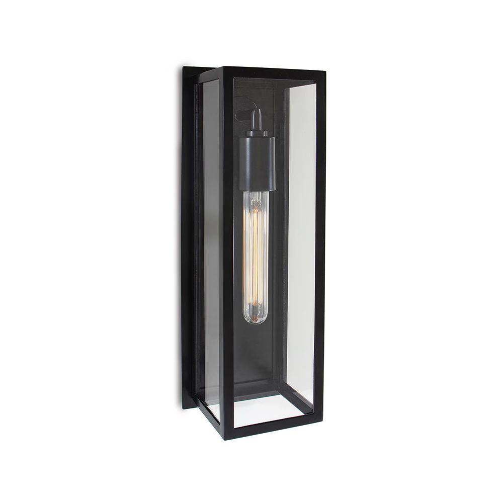 Powder coated Black lantern sconce with glass panels. Damp rated for outdoor use.