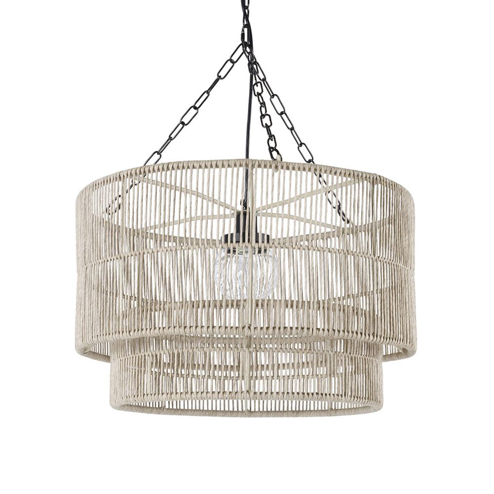 Pendant in powder coated metal frame hand-woven with oatmeal color all-weather synthetic wicker. Pendant comes with a matte black finished 9' chain and 5" dia. canopy hanging kit. Socket is enclosed in a glass globe for protection from water. Suitable for outdoor use in a wet location.