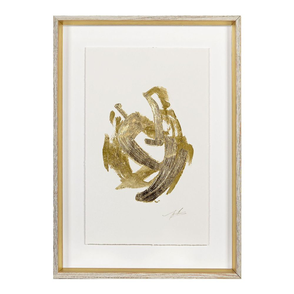 Precious abstract symbols with gold gild embellishment in a natural white wash wood frame.